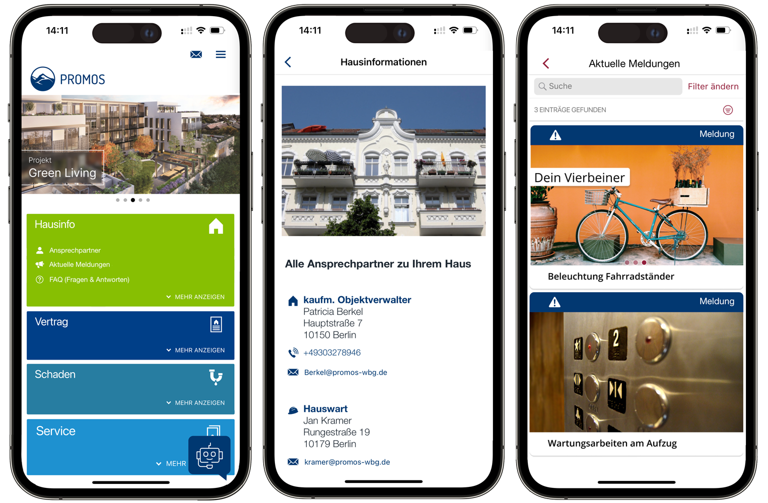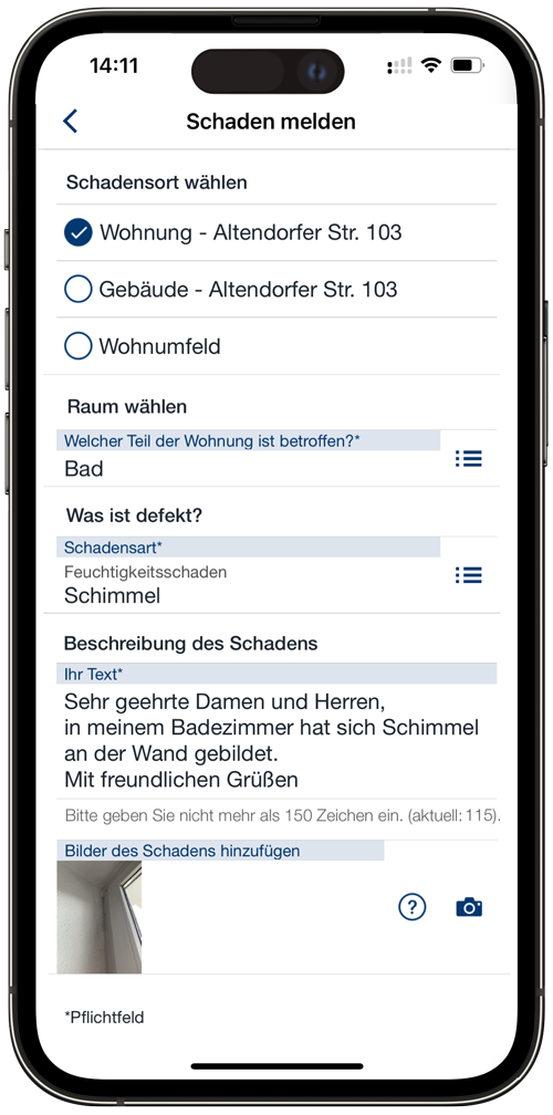 Schnell und direkt können Mieterinnen und Mieter neue Schäden melden oder vergangene Meldungen einsehen. Ein Katalog von Schadensmeldungen – abgeleitet aus dem ERP-System – erleichtert sowohl die Eingabe für Mieter als auch die Zuordnung im Unternehmen. Zudem lassen sich Fotos ergänzen und durch vordefinierte Statusänderungen zum Reparaturprozess bleiben Mieter immer über den neuesten Stand informiert.