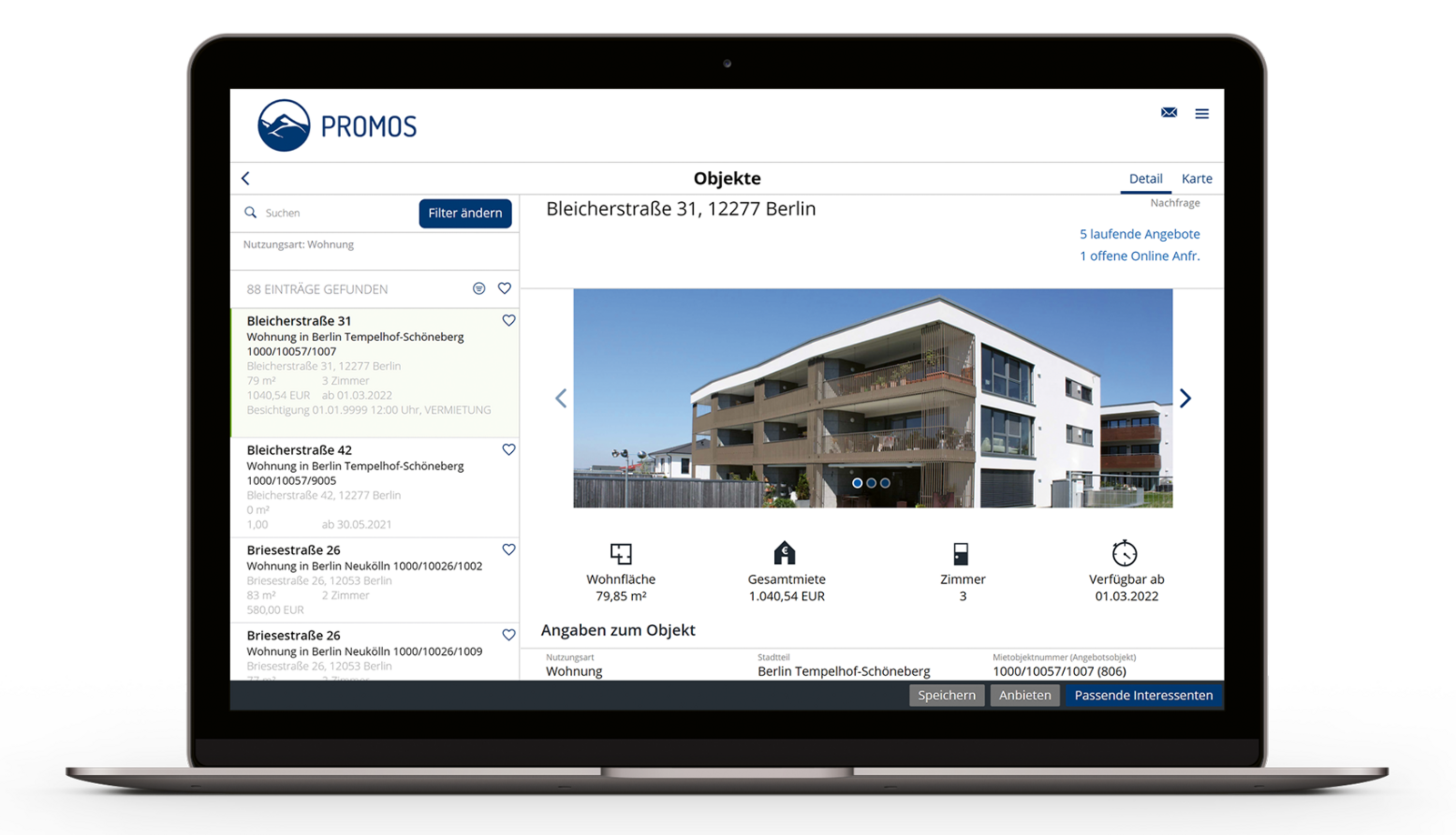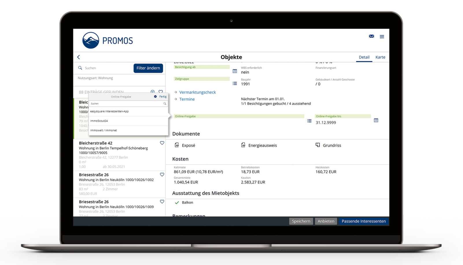 Digitale Vermarktung: Mit wenigen Klicks lässt sich die Vermarktung Ihrer Objekte über verschiedene Kanäle, wie die Interessenten-App oder externe Portale (ImmoScout, Immowelt, Kleinanzeigen etc.), anstoßen. Die Objektdaten werden strukturiert übertragen und müssen nicht mehr händisch eingegeben werden.
