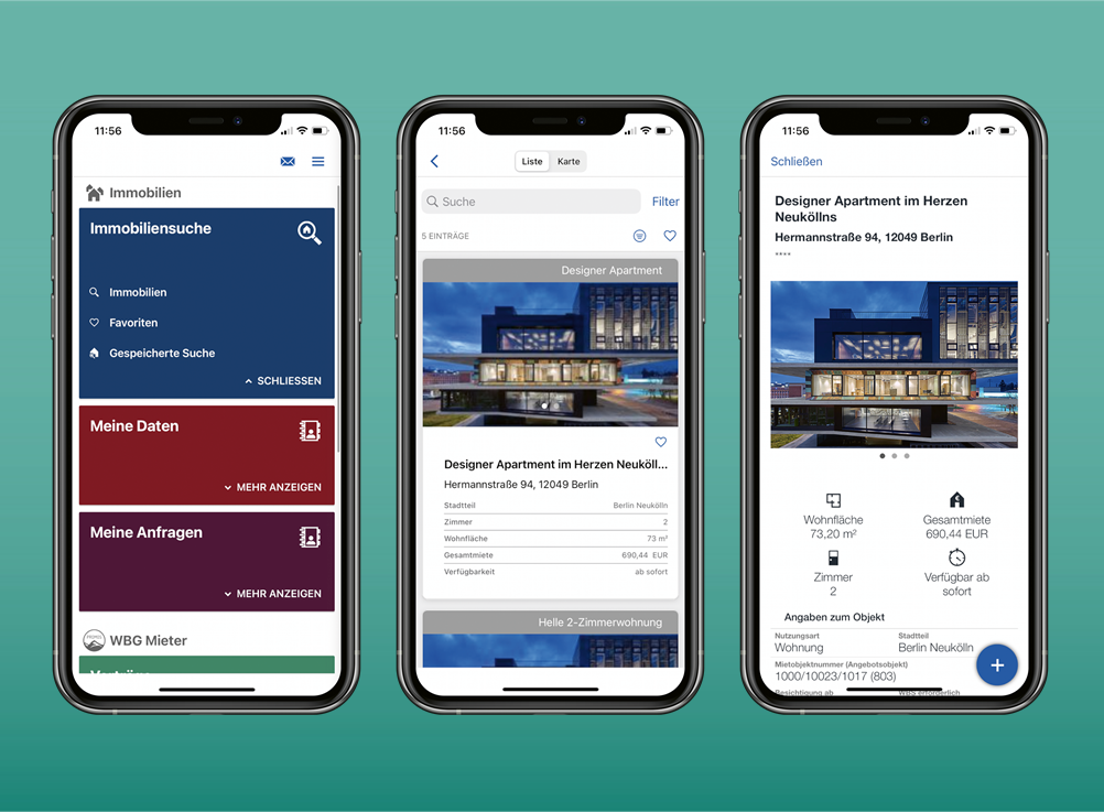 ![]() Abbildung 2: Wohnungssuche leicht gemacht! In der App können Kunden Immobilien suchen, Anfragen für Objekte versenden und ebenfalls verfügbare Slots für die Besichtigung selbst buchen. Dadurch können Sie Ihren Verwaltungsaufwand signifikant verringern. |