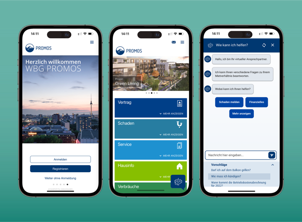 Abbildung 1: In der easysquare Mieter-App kann die Mieterschaft vielfältige Dienste nutzen. Optional steht auch unser virtueller Assistent PROMi für einfache Anfragen über eine Chatfunktion zur Verfügung.