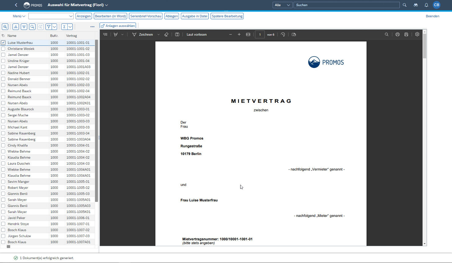 Nach Auswahl der benötigten Vorlage in SAP Fiori® wird mit Hilfe eines Selektionsfensters das entsprechende SAP®-Objekt ausgewählt, aus dem sich die benötigten Daten speisen sollen. Ist keine manuelle Nachbearbeitung in Microsoft® Word erforderlich, wird vor dem Druck eine nützliche PDF-Vorschau erzeugt.