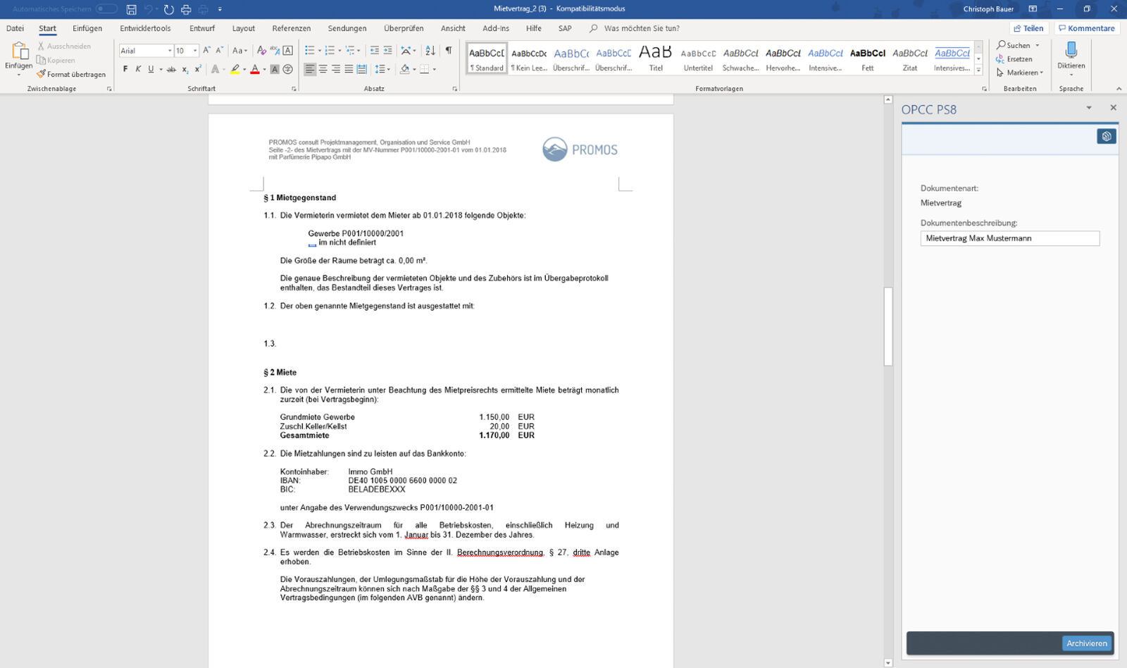 - Archivierungsfunktion: Diese ermöglicht es Ihnen, im SAP® System eine umfangreiche Historie zu generieren. Jedes Dokument kann im PDF-Format direkt einem Objekt, z. B. einem Immobilienvertrag, zugeordnet werden.